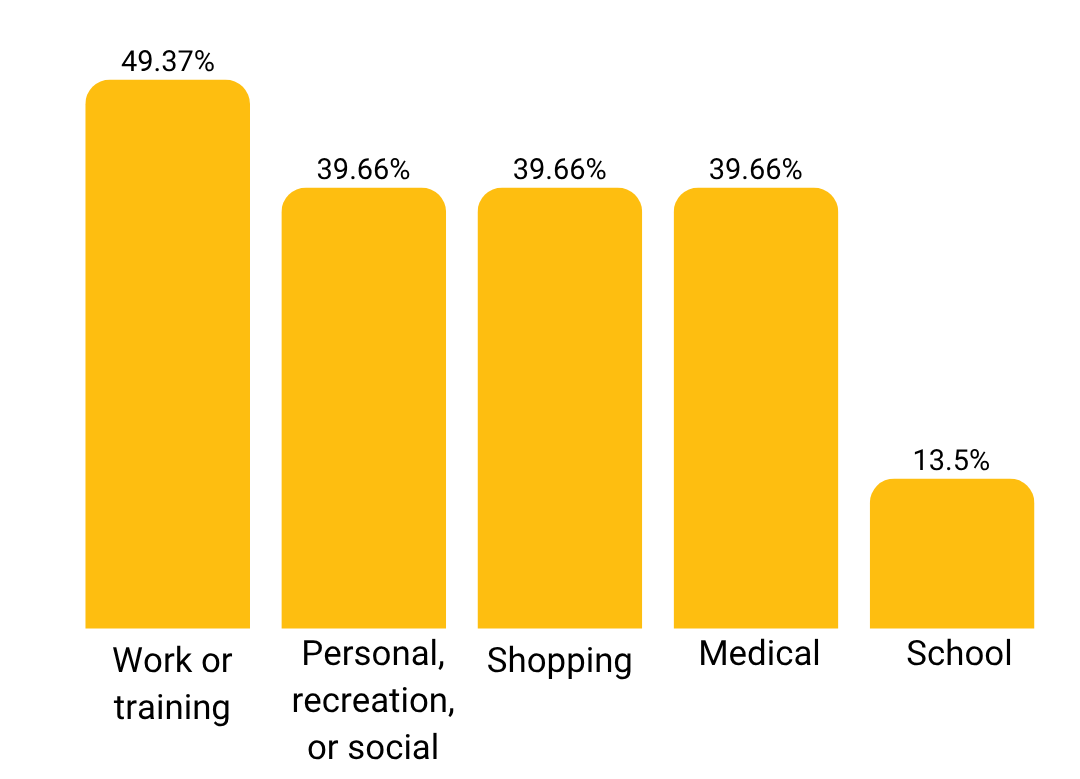 More than 49% of survey respondents ride TVT buses to get to work or participate in employment training. Riders also shared that they rely on the bus for many other everyday trips, including personal, recreational, and social outings, as well as shopping and medical appointments.