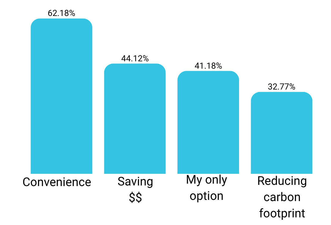 Convenience plays a major role in why riders choose TVT, with 63% of respondents citing it as a key factor. Saving money is another important reason people ride. Nearly 42% of riders shared that the bus is their only transportation option, underscoring how essential public transit is for many rural Vermonters.