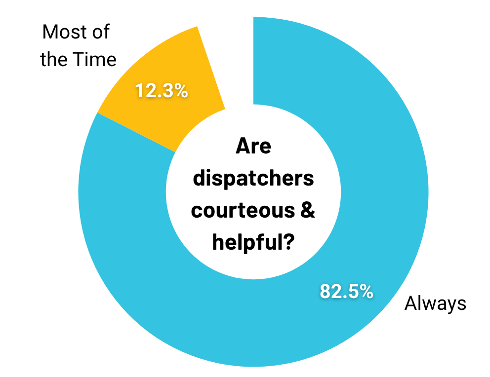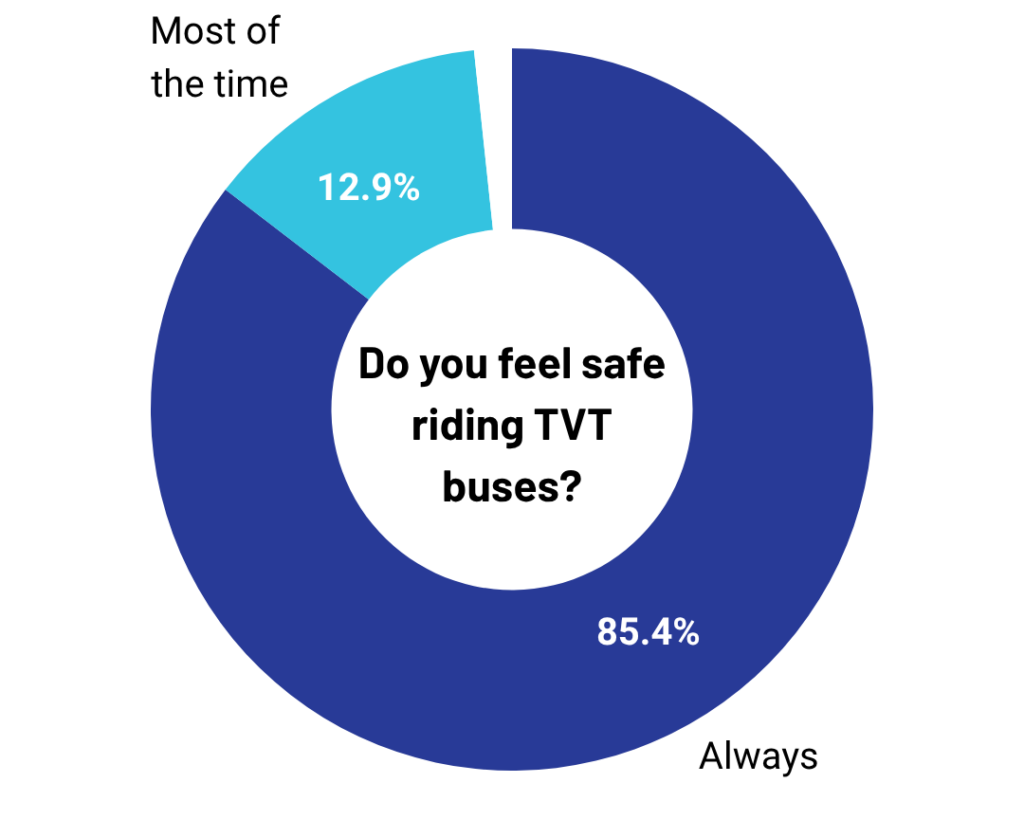 Riders shared very positive feedback about safety and customer service. More than 98% of respondents said that they feel safe riding TVT buses always or most of the time. Driver interactions received strong ratings, with 99% reporting that drivers are always or usually helpful and courteous. Dispatch staff were also viewed positively, with nearly 95% rating them as helpful and courteous always or most of the time.